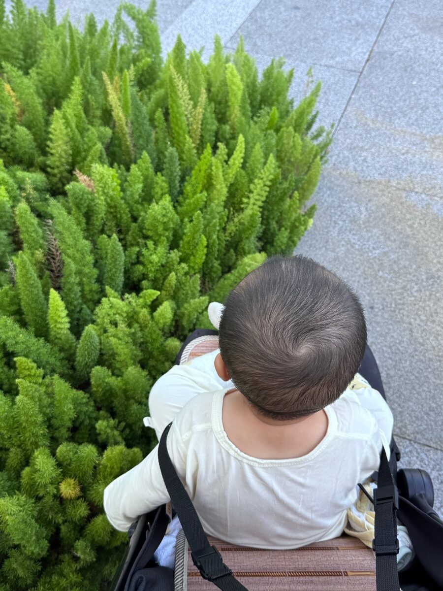 我们推车带小新新去公园的路上,我在后面推婴儿车,问小新新:“妈妈在哪里?”