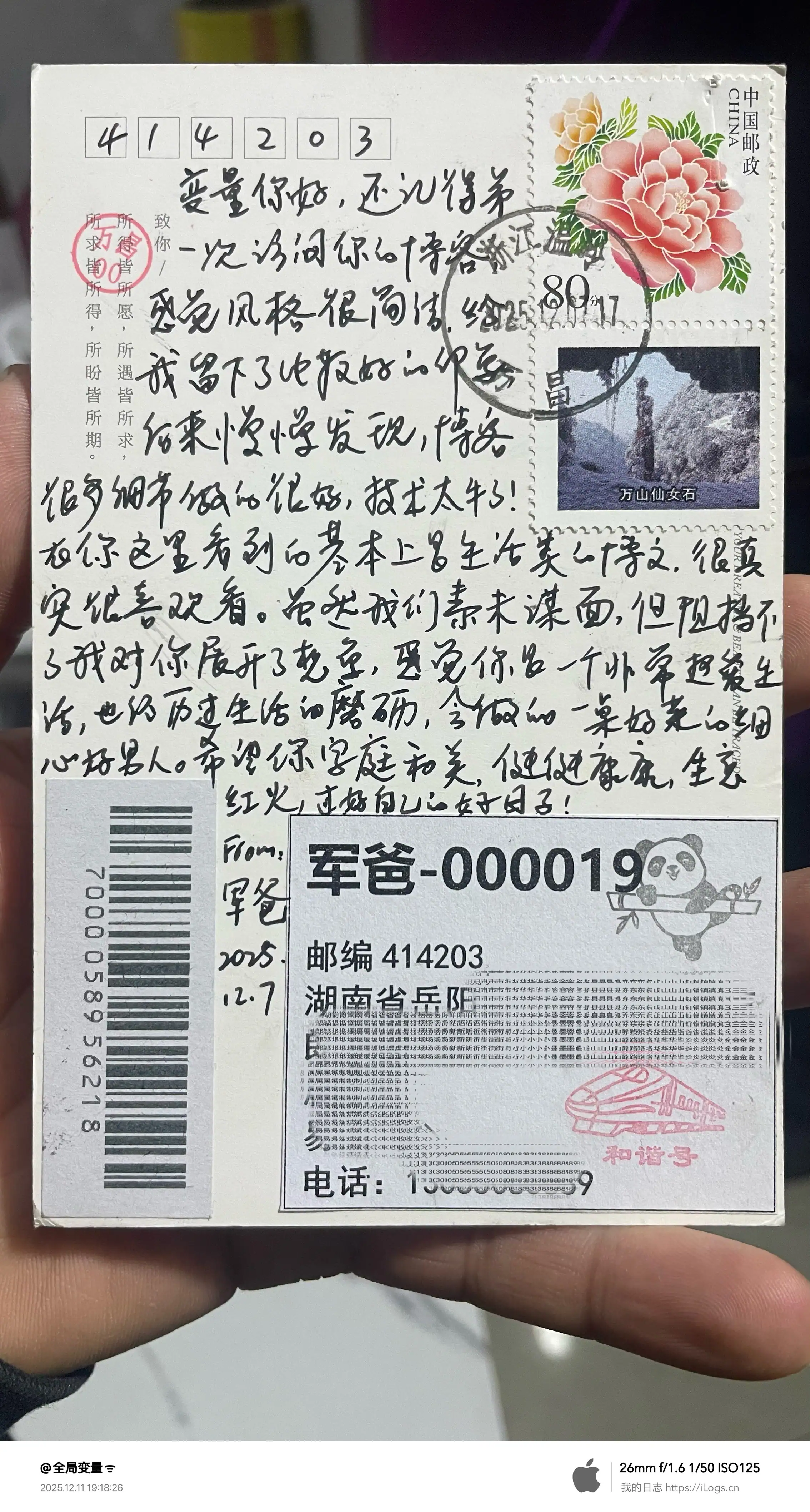 前些天,我收到了 “我是军爸” 寄来的明信片。其实在邮寄途中,我一度担心会丢失,和我同步申请这张明信片的 “李的日志”,我们是同一天收到寄出通知的,可他比我早好几天就收到了。又过了两天,我妈突然打来视频,说收到了一张寄给我的明信片,还说等吃完饭就给我送过来。我通过摄像头,看着家里好几个人凑在一起,逐一传递着阅读明信片上的内容,忍不住笑了出来。后来才知道,明明写的是我的地址,却投递到了我爸妈那里,原来是邮递员和我爸妈熟络,而且我爸妈住的地方离邮政网点更近,他便顺手把明信片放在了我爸妈那边,也算是个小小的意外。
